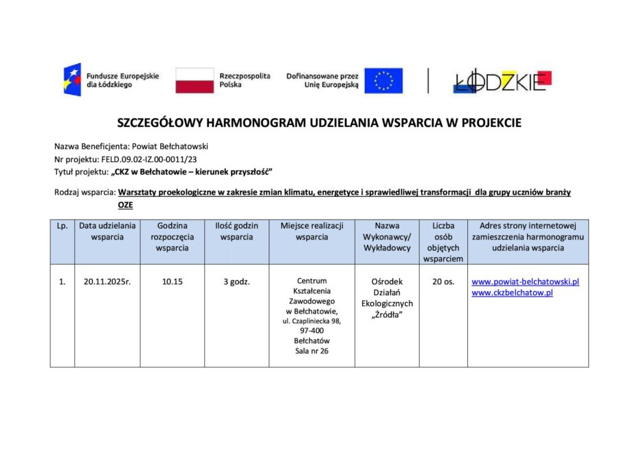 W związku z wolnymi miejscami na warsztaty proekologiczne Powiat Bełchatowski ogłasza nabór uzupełniający do udziału w projekcie „CKZ w Bełchatowie – kierunek przyszłość” współfinansowanego ze środków Funduszu na rzecz Sprawiedliwej Transformacji w ramach Programu Regionalnego Fundusze Europejskie dla Łódzkiego 2021-2027. Nabór przeznaczony jest dla uczniów/uczennic wszystkich kierunków pobierających praktyczną naukę zawodu w Centrum Kształcenia Zawodowego w Bełchatowie.
