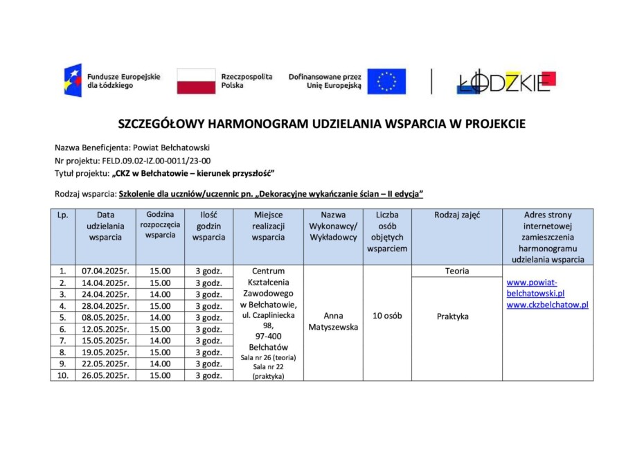 2) Zajęcia specjalistyczne „Dekoracyjne wykańczanie ścian” dla 10 uczniów/uczennic technikum budownictwa oraz zawodu monter zabudowy robót wykończeniowych, pobierających praktyczną naukę zawodu w Centrum Kształcenia Zawodowego w Bełchatowie,
